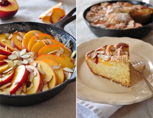 hạnh nhỏ và các miếng đào tươi ngon đặt lên trên và hơi xém. Đây là món