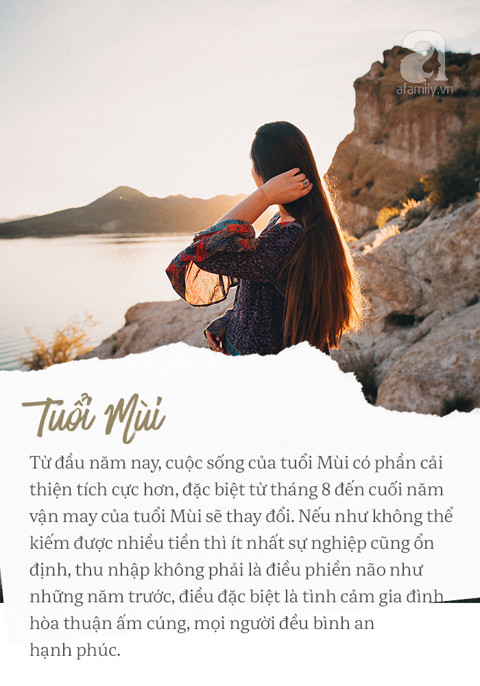 Trời sinh tuổi Mùi có tính cách tự tin và luôn quyết đoán trong mọi chuyện. Tuy nhiên, nhược điểm chính của họ là không biết nắm bắt thời cơ, và thường bỏ qua những lúc quan trọng để đổi vận. Từ đầu năm nay, cuộc sống của tuổi Mùi có phần cải thiện tích cực hơn, đặc biệt từ tháng 8 đến cuối năm vận may của tuổi Mùi sẽ thay đổi. Nếu như không thể kiếm được nhiều tiền thì ít nhất sự nghiệp cũng ổn định, thu nhập không phải là điều phiền não như những năm trước, điều đặc biệt là tình cảm gia đình hòa thuận ấm cúng, mọi người đều bình an hạnh phúc. Dự kiến vào khoảng tháng 11, sẽ tiếp tục xuất hiện cơ hội có một không hai hoặc có quý nhân phương xa xuất hiện, lần này nếu tuổi Mùi biết nắm bắt thì coi như đổi đời, tiền bạc dư dả, đủ sống thoải mái đến hết đời. Những cay đắng ngày trước đã qua, từ bây giờ trở đi tuổi Mùi hãy chuẩn bị tinh thần để đón quả ngọt.