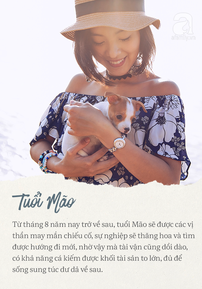 Trong số 12 con giáp, tuổi Mão là những người nhạy cảm và rất chu đáo. Bất kể là ở hoàn cảnh nào, họ cũng biết đối nhân xử thế, khéo léo trong giao tiếp nhờ vậy mà được mọi người yêu quý. Tuổi Mão mạnh mẽ và luôn lường trước được những hậu quả về những việc làm của mình, họ có trách nhiệm và gánh được mọi rủi ro không ngờ đến. Có thể nói, nhờ sự kiên định đó mà tuổi Mão dễ dàng gặt hái được nhiều thành công vào trung niên. Đặc biệt trong năm nay, từ tháng 8 trở về sau, tuổi Mão sẽ được các vị thần may mắn chiếu cố, sự nghiệp sẽ thăng hoa và tìm được hướng đi mới, nhờ vậy mà tài vận cũng dồi dào, có khả năng cá kiếm được khối tài sản to lớn, đủ để sống sung túc dư dả về sau. Hơn thế nữa, tuổi Mão hãy chuẩn bị tinh thần đón lộc trời cho trong năm nay, vì gia đình sẽ đón thêm thành viên mới, mang đến vận may cho mọi người.