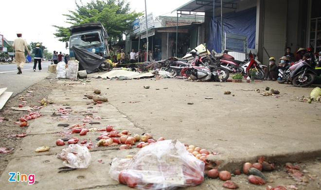 “Sáng nay, chị Thoan đến trước chợ chuẩn bị qua đường thì bị xe tải lao đến cuốn vào gầm rồi đè lên người tử vong tại chỗ. Mọi người nằm la liệt, bị xe máy và ôtô tải đè lên”, ông Tiền nói.
