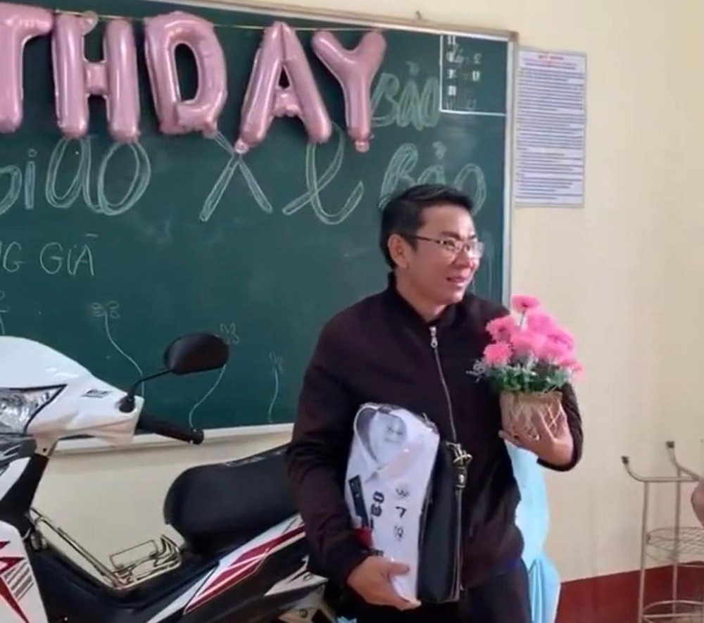 Theo đó, clip có nội dung "Buổi sinh nhật bất ổn nhất sự nghiệp giáo viên thầy chủ nhiệm". Được mở đầu bằng hình ảnh một học sinh dắt chiếc xe máy, rồi một nhóm phụ giúp đẩy, công kênh chiếc xe trắng còn dính bùn đất lên bục giảng của 1 lớp học ở tận tầng 3. Tại đây, 1 em ghi lên yên xe "bất ngờ chưa ông zà haha". Sau đó chiếc xe được trùm kín bằng 1 tấm vải.