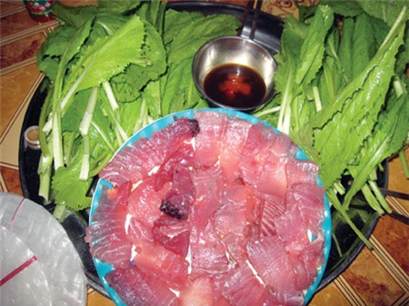 vào bát rồi khuấy đều để làm nước chấm. Từng miếng thịt cá màu hồng tươi