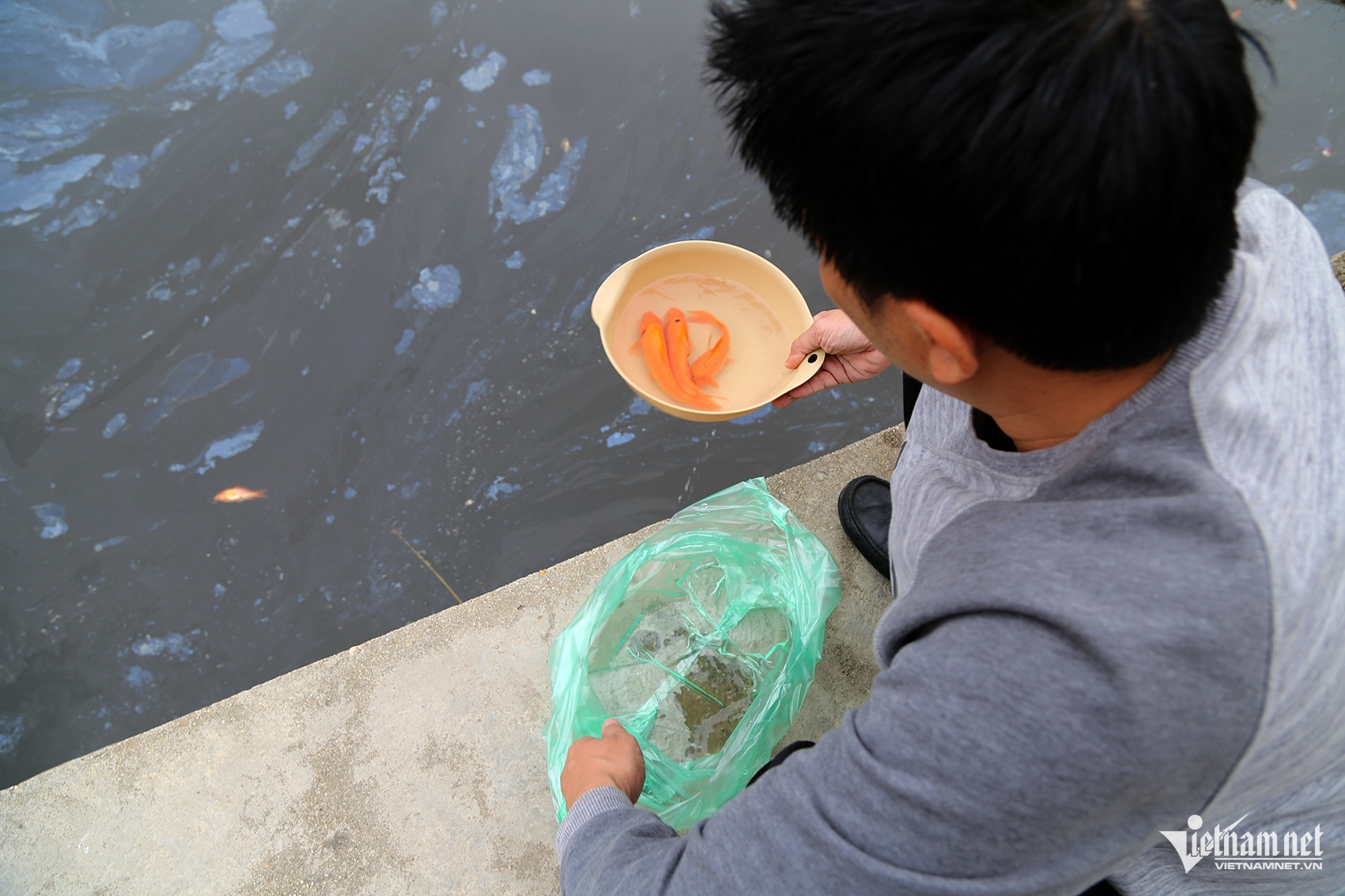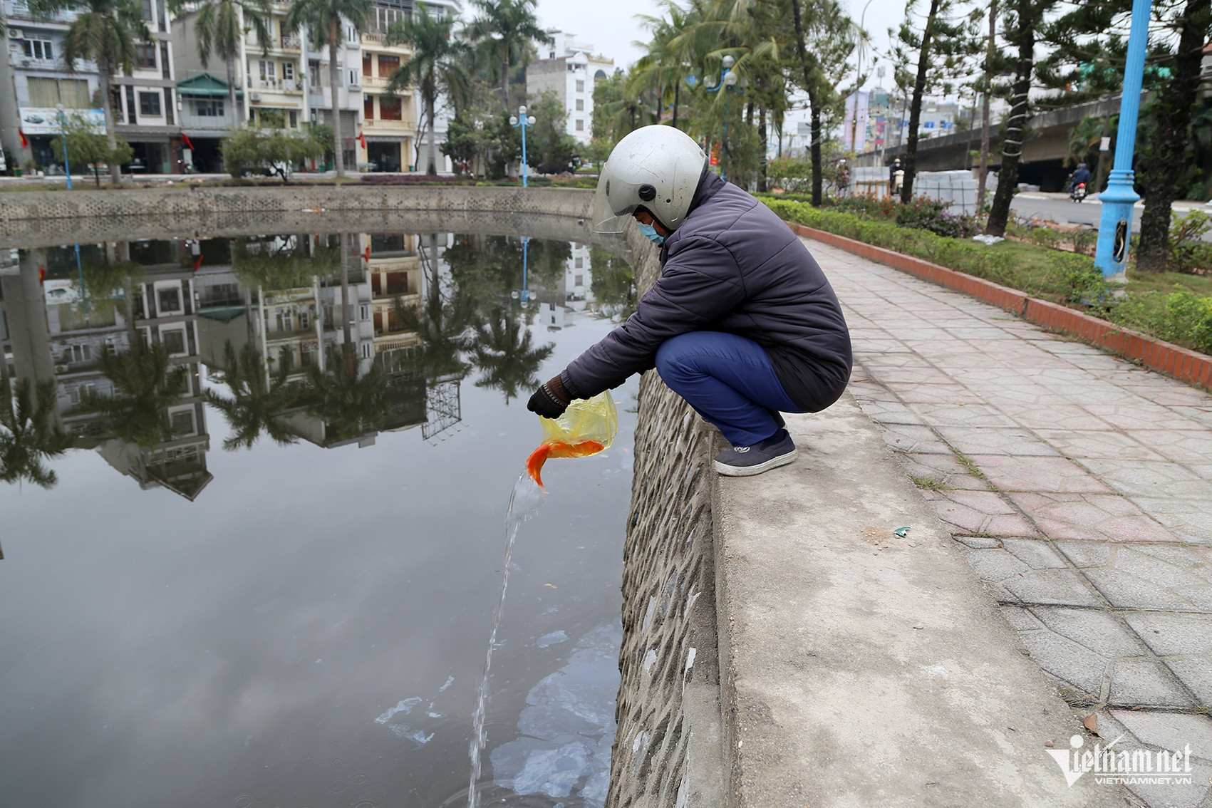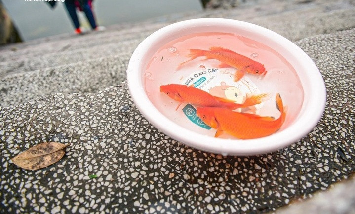 Không ít người mang theo xô, chậu cá từ sáng sớm, thành kính thả cá với mong muốn gửi gắm ước nguyện một năm mới bình an, may mắn.