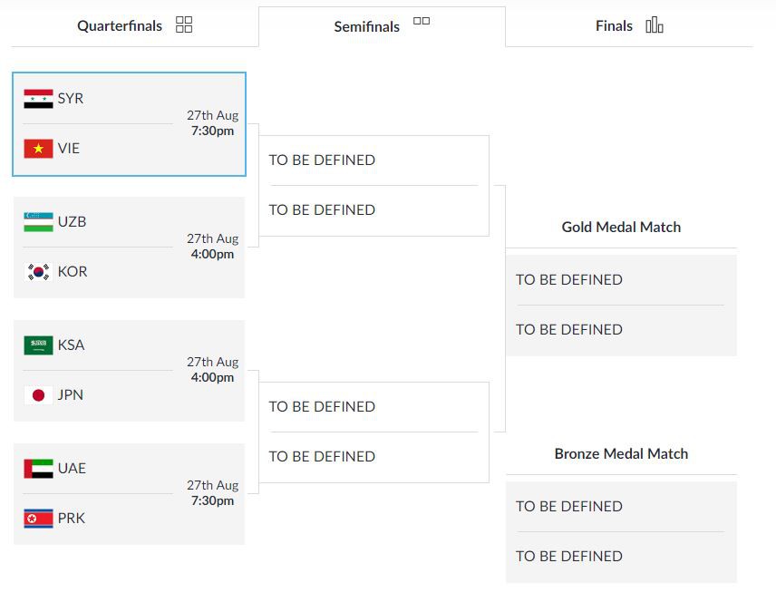 Thế nên cả Đông Nam Á lúc này chỉ còn mỗi Olympic Việt Nam là góp mặt ở tứ kết ASIAD. 7 đội còn lại tranh HC vàng môn bóng đá nam là Syria, Uzbekistan, Hàn Quốc, Nhật Bản, UAE, Triều Tiên và Ả-rập Saudi.