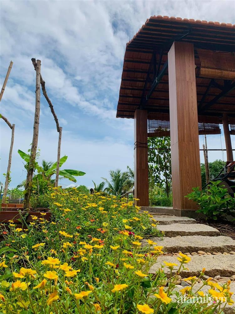 Không gian nối liền với ao cá, hai bên lối đi được trồng mười giờ Thái sai hoa tạo nên vẻ đẹp rực rỡ, mềm mại đầy cuốn hút cho khu vườn.