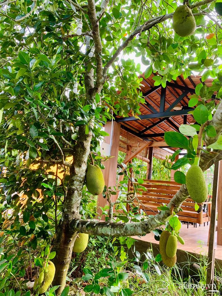 Bên cạnh ao cá, khu vực thả sen, mảnh vườn có khoảng diện tích khá rộng rãi trồng đa dạng các loại cây ăn trái, trong đó nhiều nhất là xoài, chuối, dừa… Ngoài ra còn có táo Thái, mãng cầu, thanh nhãn, sapo, bơ, dâu tằm, ổi…