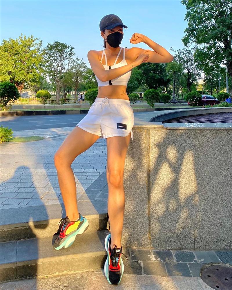 Đôi khi cô sẽ ra sân để chạy bộ, không quên đeo khẩu trang để tránh dịch bệnh.