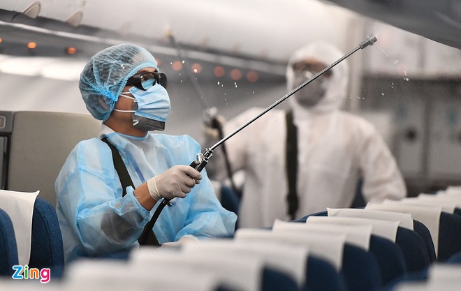 Khử trùng máy bay sau khi vận chuyển hành khách. Ảnh: Trung Phong. |