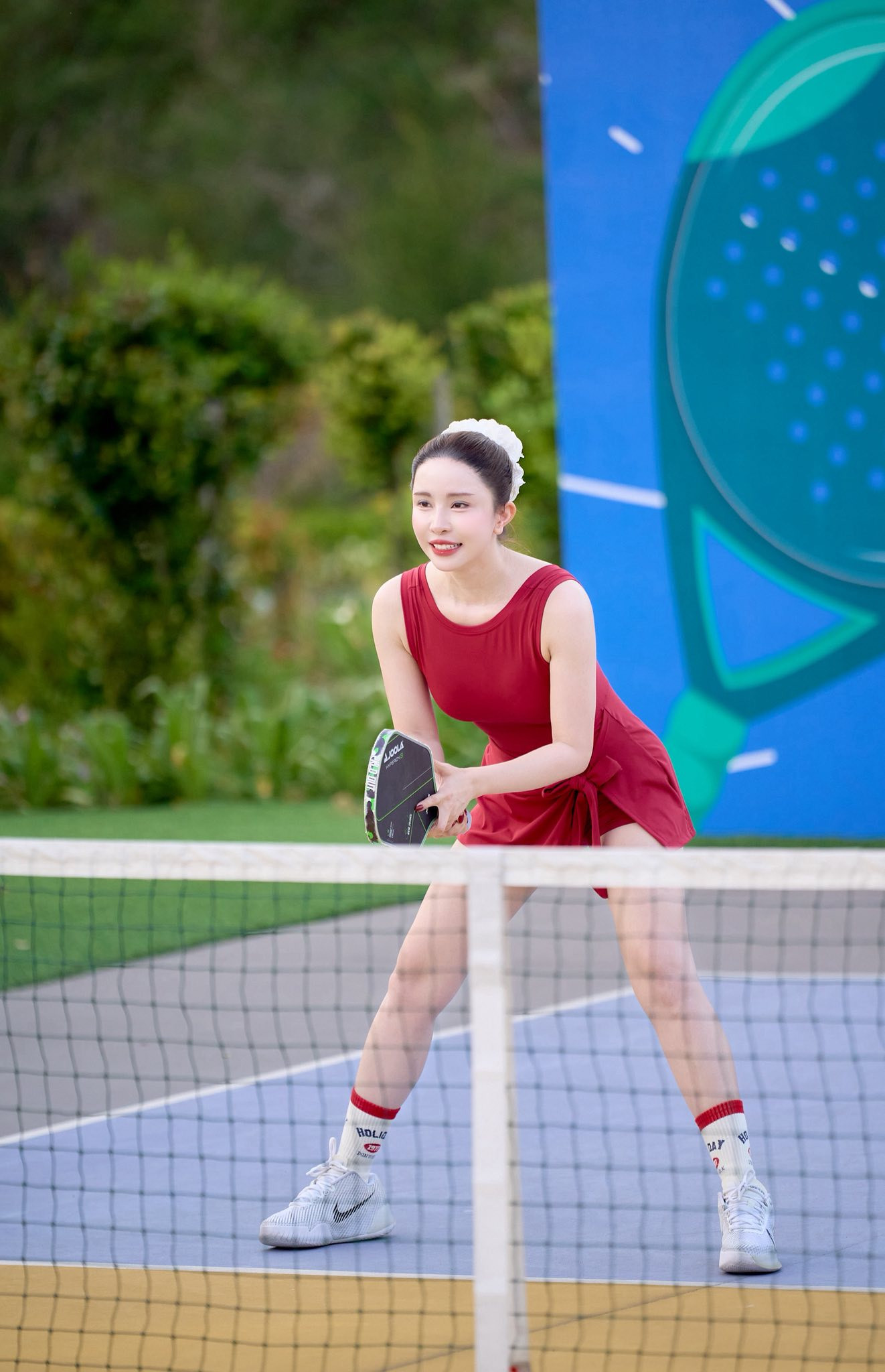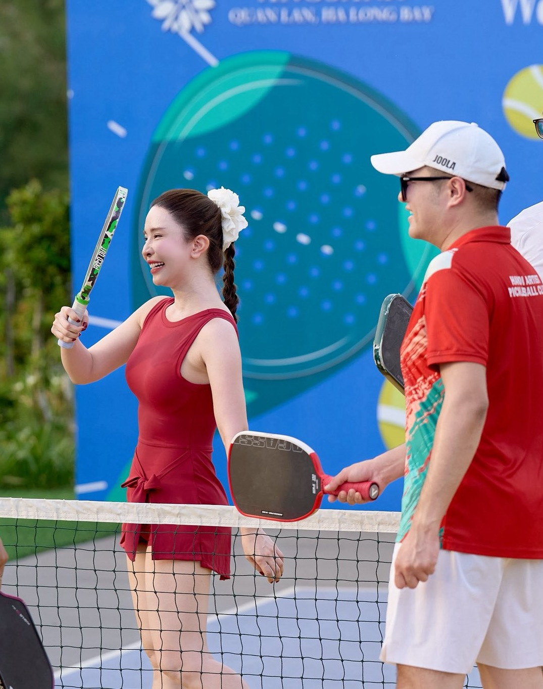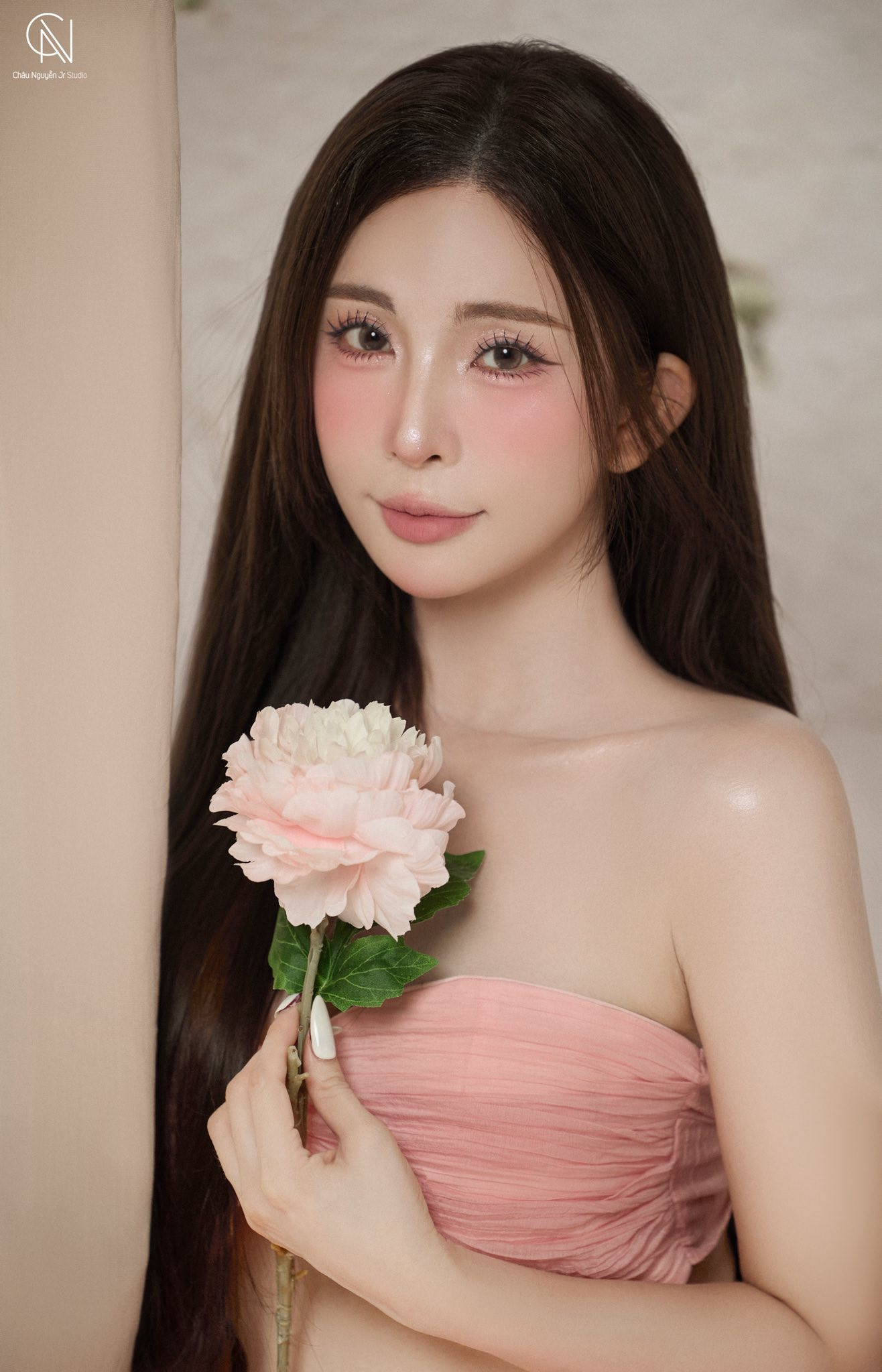 Trong hình, nữ diễn viên xuất hiện với giao diện "thần tiên tỉ tỉ" trong thiết kế màu hồng gồm áo chẳng tày gang chỉ che chắn đủ vòng một cùng chân váy dài đồng điệu.