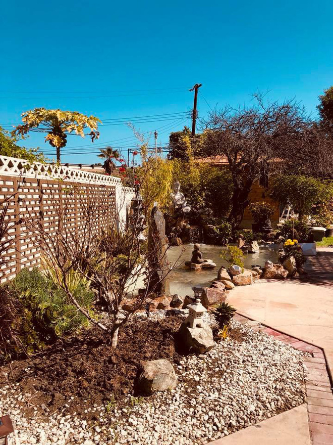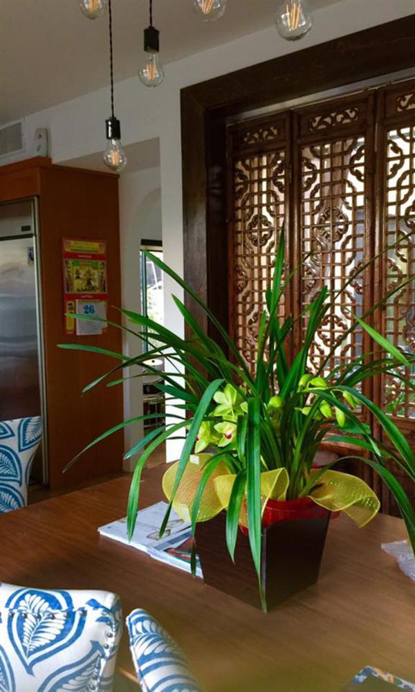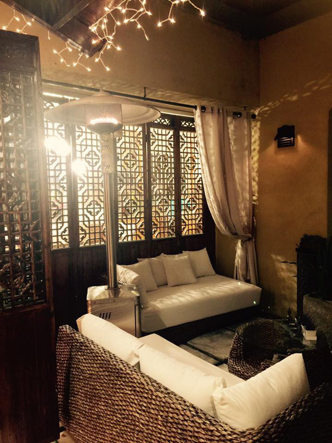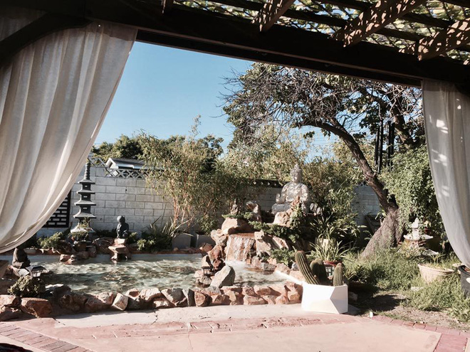 Khoảng sân sau dường như lại có sự đối lập với sân trước bởi nữ ca sĩ dành cách trang trí tĩnh lặng và yên bình nhất, từ cây cỏ đến cách décor tượng Phật tạo nên không gian an yên, bình dị.