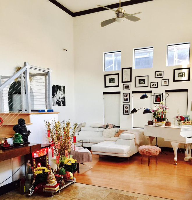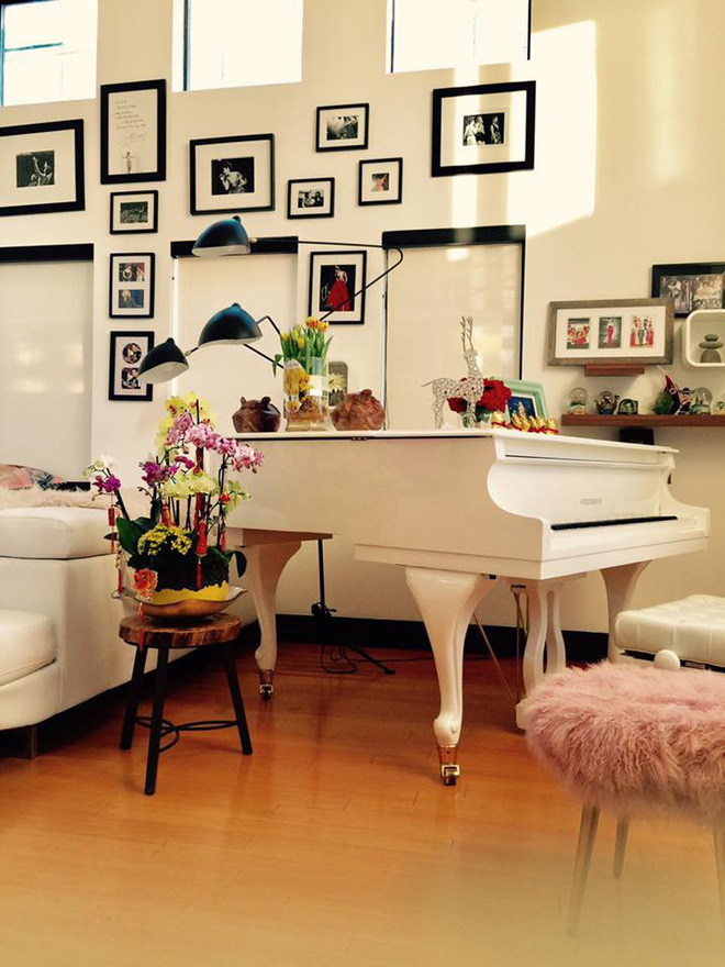 Khoảng không gian phòng khách là nơi nữ ca sĩ đặt sofa, bàn trà tiếp khách. Góc bên cạnh là nơi đặt chiếc đàn piano màu trắng cùng tông với màu tường. Những vật dụng trang trí đủ xinh yêu và thân thuộc giúp cho mọi người như vui vẻ và gắn kết với nhau hơn khi sinh hoạt, gặp gỡ trong cùng một không gian.