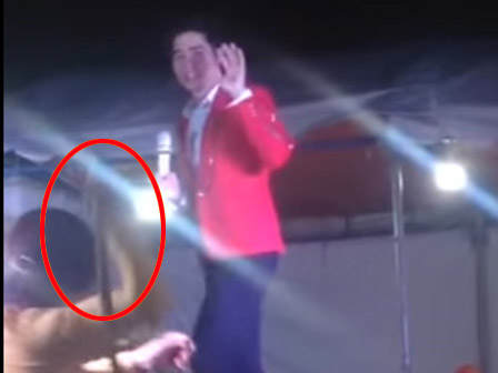 | Hình ảnh một khán giả nữ cầm gậy đánh ca sĩ. |