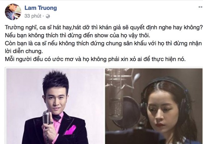Sau khi nam ca sĩ Minh Quân đặt vấn đề xét duyện chuyện Chi Pu đi hát, rất nhiều ca sĩ đã trực tiếp lên tiếng phản pháo trên trang facebook cá nhân của minh.