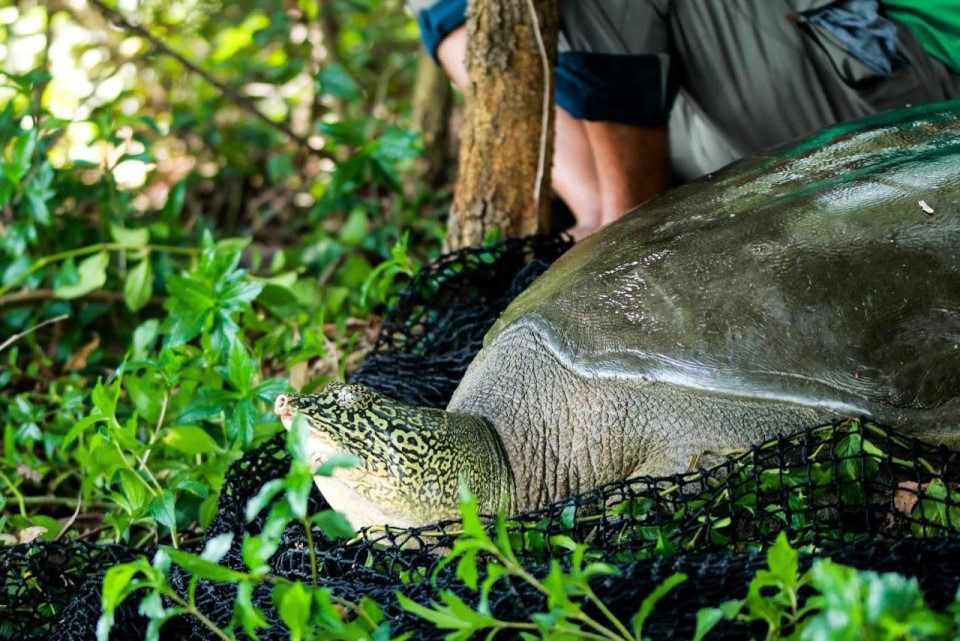 Năm 2020, lực lượng chức năng bẫy được 1 cá thể rùa mai mềm ở hồ Đồng Mô. (Ảnh: IMC)