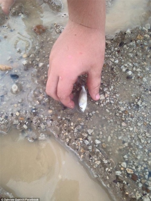 “Những đứa trẻ đã bắt được 5 con cá này, chúng đi bộ quanh nhà, mò tay xuống những vũng nước nhỏ là có thể bắt được những con cá vẫn đang nằm ngoe nguẩy trong tay”, Oakhill khoe trên trang Facebook cá nhân.