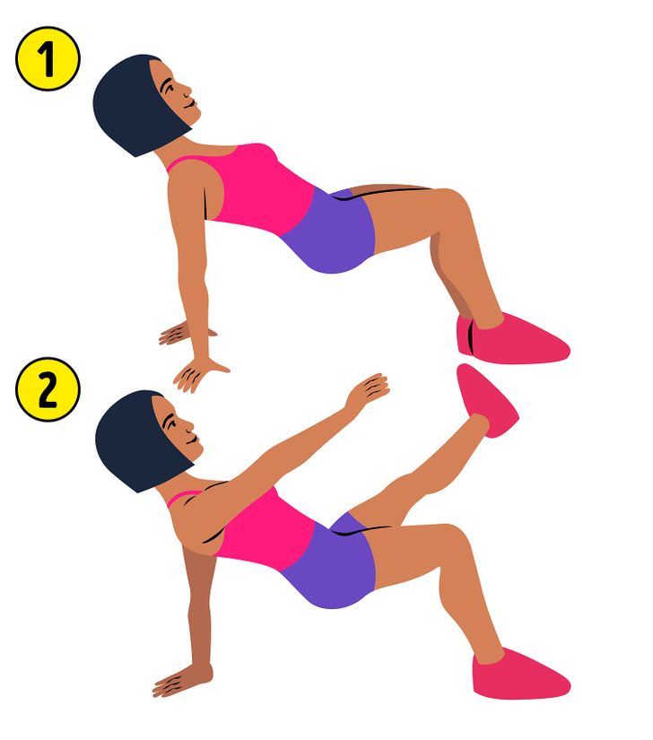 Bài tập này cũng giúp xây dựng cơ mông, bắp chân và gân kheo. Đầu tiên, thực hiện bài tập trong 30 giây, sau đó nghỉ 20 giây và lặp lại 5 lần. Động tác này giúp giảm cân, tăng cường cơ bắp và thúc đẩy quá trình trao đổi chất.