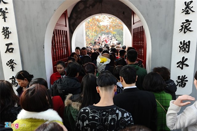 Tại đền Ngọc Sơn, Tết năm nay đông khách hơn các dịp Tết trước. Phía cổng vào và cầu Thê Húc luôn bị tắc nghẽn bởi hàng trăm người xếp hàng vào tham quan. |