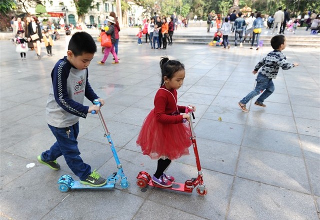| Các trò chơi trong công viên khiến các bé thích thú. Thời tiết trong ngày mùng 3/1 âm lịch nắng đẹp, ấm áp hơn dịp trước Tết. |