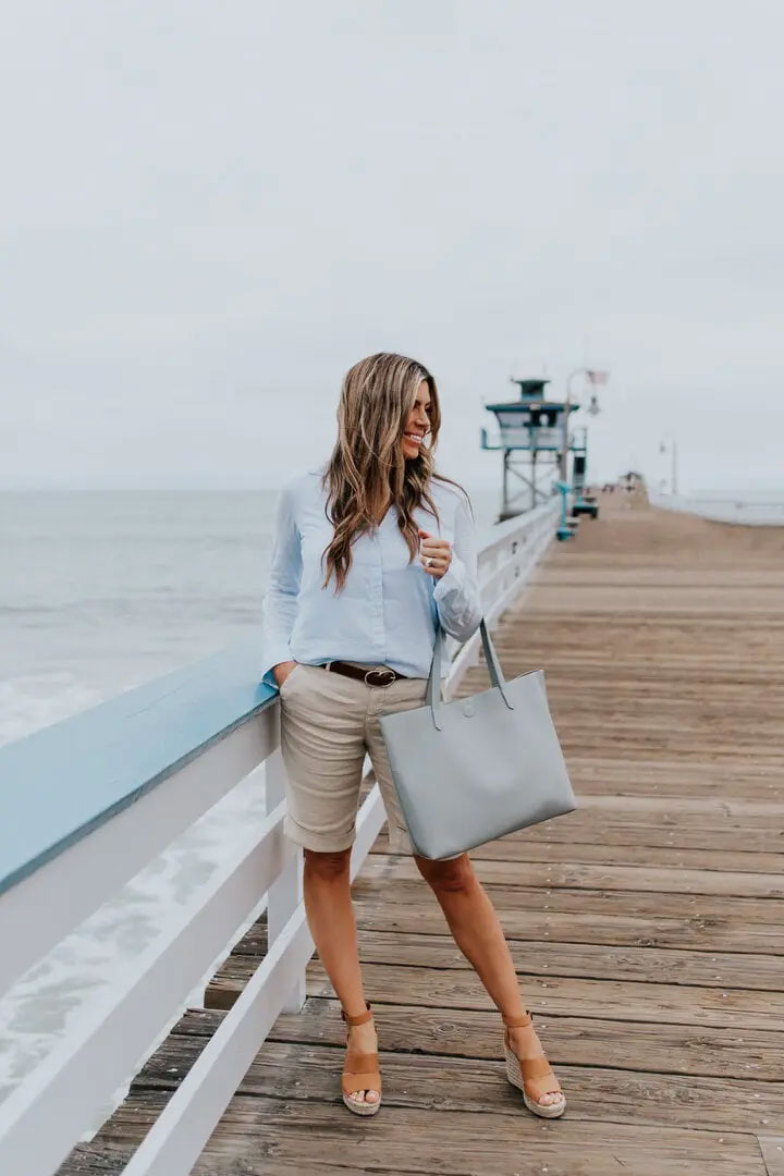 Quần bermuda là kiểu quần shorts có độ dài đến đầu gối hoặc ngang bắp chân. Kiểu quần này có thiết kế thoải mái, linh hoạt, dễ dàng kết hợp theo nhiều phong cách khác nhau, mang đến vẻ đẹp thanh lịch và sang trọng cho người mặc. Bạn có thể thử mặc cùng áo bralette quyến rũ, áo thun năng động hoặc áo sơmi phù hợp với môi trường công sở.