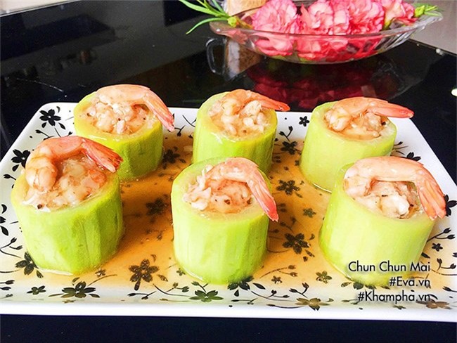 Nhồi hỗn hợp tôm thịt ở trên vào trong từng khoanh bầu, phía trên trang trí phần đuôi tôm cho đẹp.