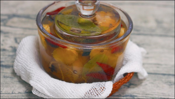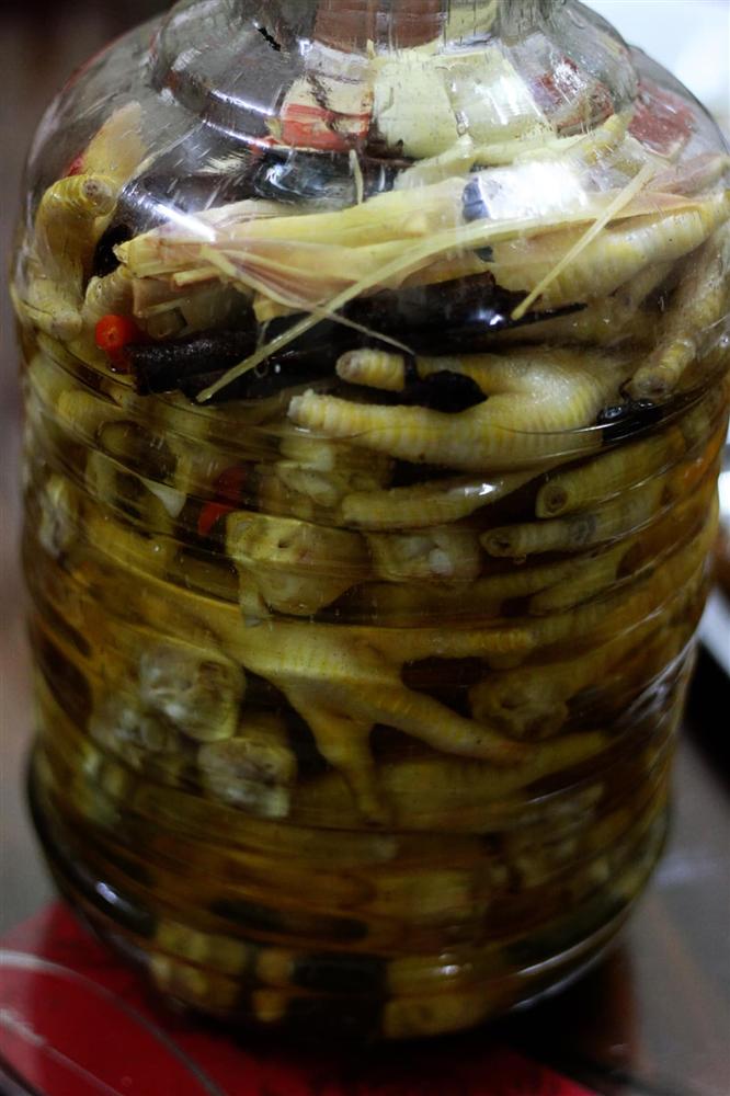 - Dùng 1 hũ thủy tinh to hoặc hộp nhựa đã tiệt trùng. Xếp chân gà vào, đổ phần nước ngâm đã nguội hẳn vào, cho hạt tiêu, ớt, tỏi bóc vỏ vào, dùng que đan nén xuống hoặc bịch nilon có chứa nước để nén chân gà xuống, đậy nắp và bỏ vào ngăn mát tủ lạnh. Sau 2 ngày có thể ăn được.
