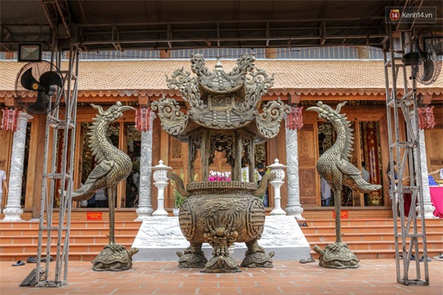 Lư hương trời bằng đồng được đặt trước cổng chính, hai bên là tượng chim hạc đứng trên mai rùa.