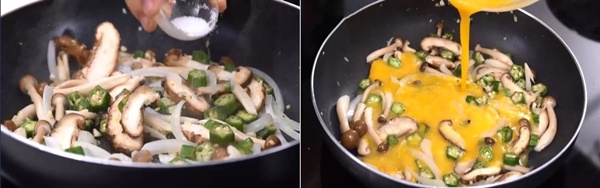 Đun nóng chút dầu ăn trong chảo, cho tỏi băm vào xào thơm sau đó đổ hành tây vào đảo đều. Sau đó thêm đậu bắp, nấm hương, nấm hải sản vào đảo chung.