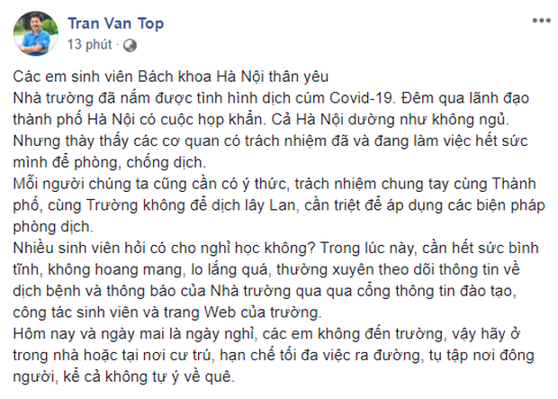 Thầy Nghĩa chia sẻ: "Các em sinh viên đã về Hà Nội rồi, mong các em thông cảm và hạn chế đi lại, không đến các khu vực tập trung đông người, thực hiện nghiêm túc khuyến cáo về phòng dịch của Bộ Y tế và Bộ GD-DT nhé. Các em đang ở KTX cần tuân thủ nghiêm ngặt các quy định phòng dịch. Nhà trường tiếp tục không tiếp nhận sinh viên vào ở KTX".