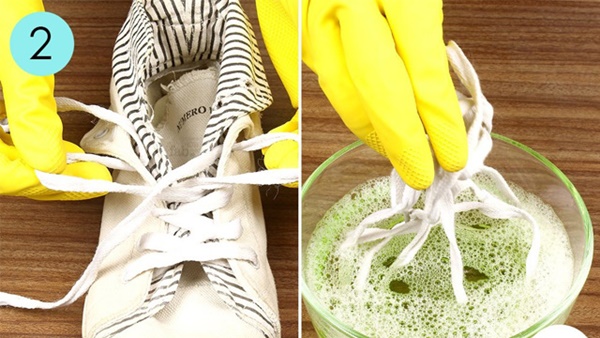Đừng mải miết lo cho đôi giày mà quên mất sợi dây của chúng. Chỉ cần ngâm chúng vào nước ấm và chà nhẹ nhàng cùng xà bông là dây giày bạn trắng sạch nhanh thôi!
