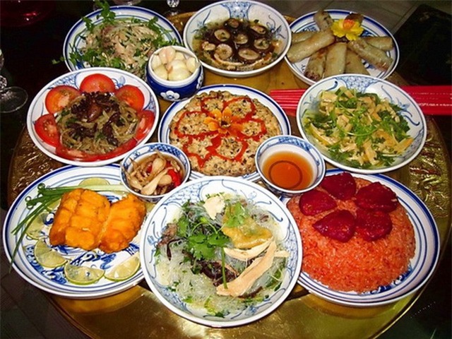 Mâm cơm truyền thống đầu năm mới của người Việt thường có bốn bát và bốn đĩa. Bốn bát gồm: 1 bát chân giò lợn nấu măng, 1 bát miến, 1 bát mọc nấm và 1 bát bóng thả. Bốn đĩa gồm: 1 đĩa thịt gà (thịt lợn), 1 đĩa giò (chả), 1 đĩa nem thính (có thể thay bằng đĩa xào) và 1 đĩa dưa muối. Ngoài ra còn có một đĩa xôi (bánh chưng) và bát nước chấm, tổng cộng là tròn mười món.