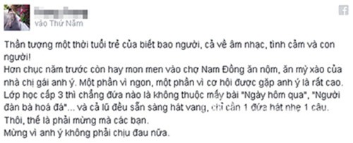 Chúng tôi từ những cậu bé 20 tuổi hợp với nhau thành 1 ban nhạc sinh viên, đi qua bao nhiêu thăng trầm, thực hiện được bao nhiêu ước mơ: từ có những cây đàn xịn, làm 1 CD riêng, 1 liveshow riêng, 1 chuyến xuyên Việt, một lần được đại diện Việt Nam diễn cho bạn bè quốc tế v.v… thậm chí có những điều chúng tôi gọi là kỳ tích, nhưng lần này, lần quan trọng nhất, không kỳ tích hay phép màu nào ghé qua, anh thật sự đã ra đi, để lại 1 khoảng trống mênh mông bất tận.
