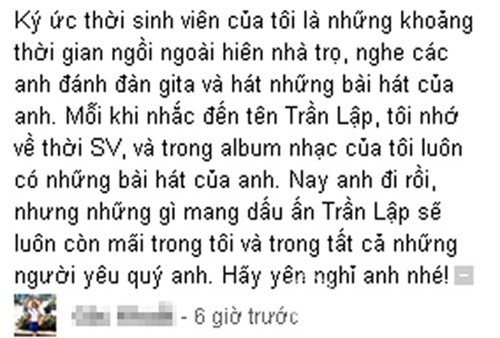 Khắp các diễn đàn, khắp các mặt báo đang khóc thương trước sự ra đi của Trần Lập. Mỗi người đều có một lời từ biệt khác nhau. Nhưng sau tất cả, mọi người đều tiếc thương cho cõi về của anh. Trần Nhất Hoàng, thành viên đời đầu của Bức Tường đã lấy đi nước mắt của hàng triệu bạn đọc sau những dòng viết đầy xúc động.
