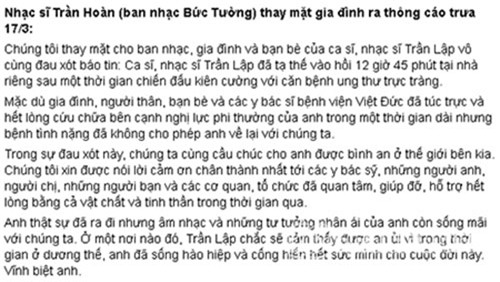Nhạc sĩ Trần Hoàn viết thông cáo về sự ra đi của Trần Lập vào trưa hôm qua 17/3 |
