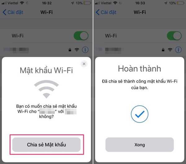 Bây giờ, bạn mở khóa thiết bị thứ nhất ở trên, và di chuyển nó lại gần thiết bị bạn cần nhập mật khẩu Wi-Fi. Ngay lập tức, thiết bị thứ nhất sẽ nhận được thông báo yêu cầu chia sẻ mật khẩu Wi-Fi từ thiết bị thứ hai. Bạn hãy bấm nút Share password (Chia sẻ mật khẩu), và mật khẩu sẽ được tự động điền vào thiết bị thứ hai. Bấm nút Connect (Kết nối) và bạn đã hoàn tất.