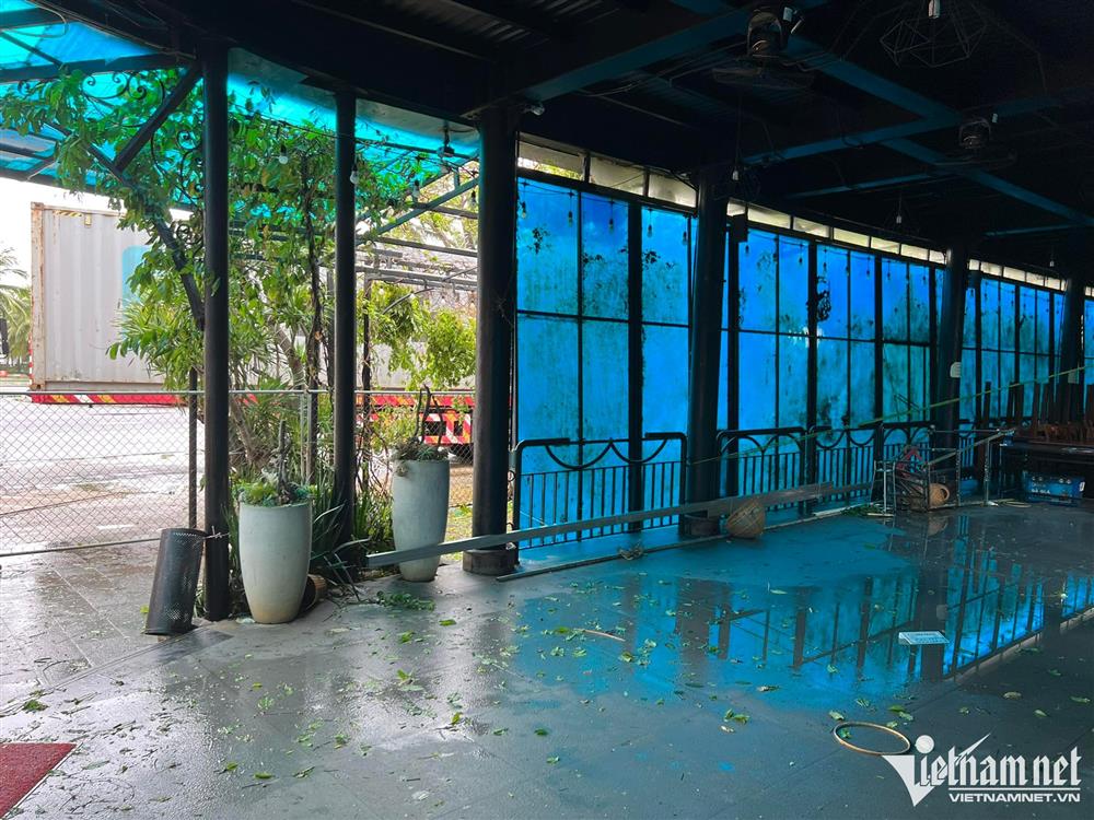 Mặc dù vậy, chiếc xe không đủ cao để chắn gió cho phần mái nhà. Sáng 28/9, sau khi đi tránh bão quay về, anh Dũng thấy khung cảnh nhà hàng tan hoang, mái bị tốc và thủng nhiều vị trí.