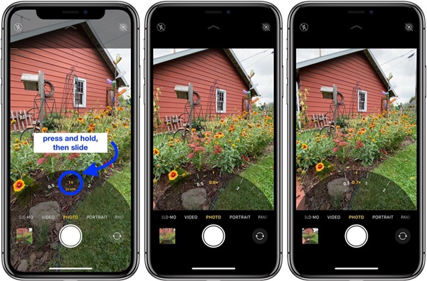 Nếu bạn muốn chọn tiêu cự thủ công, bạn chỉ cần bấm và giữ lên một trong các nút thu phóng (zoom) như 1 hoặc 0.5 và trượt nó lên trên hoặc xuống dưới như hình dưới đây.