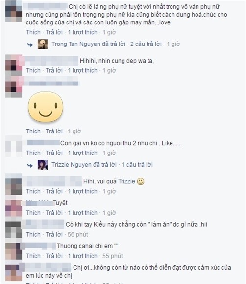 "Chị có lẽ là người phụ nữ tuyệt vời nhất trong vô vàn phụ nữ", "Việt Nam không có người phụ nữ thứ 2 như chị", "Em thật nể và ngưỡng mộ chị vô cùng. Em không làm được như thế",.. những ý kiến của dân mạng viết trên Facebook Trizzie.