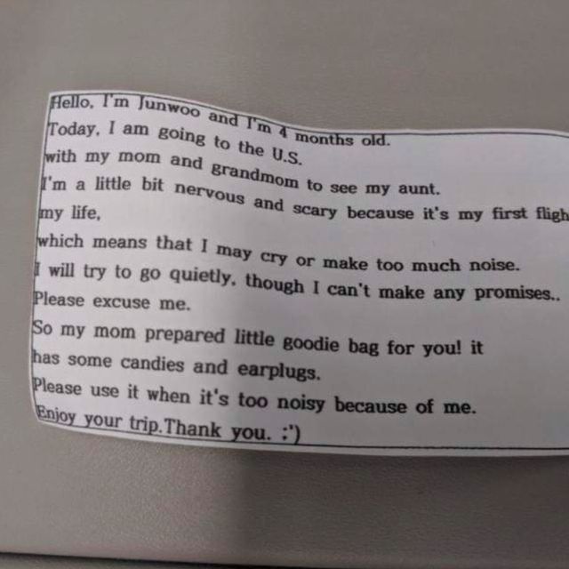 Nội dung của đoạn thông điệp mà người mẹ gửi đến cho các hành khách viết: “Xin chào, cháu là Junwoo và cháu 4 tháng tuổi. Hôm nay cháu sẽ đến Mỹ với mẹ và bà để gặp dì cháu. Cháu khá lo lắng và sợ vì đây là chuyến bay đầu tiên trong đời, nghĩa là cháu có thể khóc hoặc gây nhiều tiếng ồn.