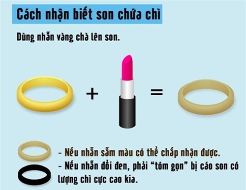 Kinh nghiệm được chị em hay truyền tai nhau để kiểm tra độ chì ở son là cho một chút son lên tay rồi dùng nữ trang bằng vàng chà xát. Nếu mỹ phẩm chuyển sang màu đen thì đó là thỏi son có chì.