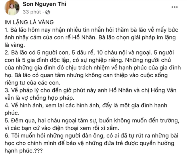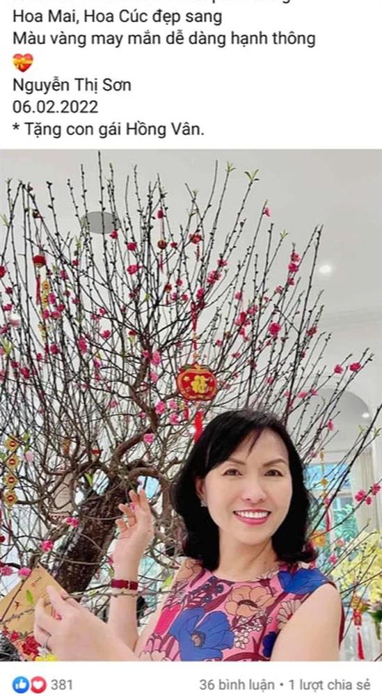 Trong 1 status được đăng tải hồi tháng 2/2022 (mùng 2 Tết) bà Sơn có nhận xét về con rể Hồ Nhân - người đàn ông đang được MXH nhắc nhiều nhất: "Con rể Hồ Nhân ít nói hơn, kiên nhẫn hơn sau quá trình vất vả nghiên cứu và thử nghiệm vaccine Nanocovax. Lòng già cũng thấy vui buồn lẫn lộn, cuộc sống mà".