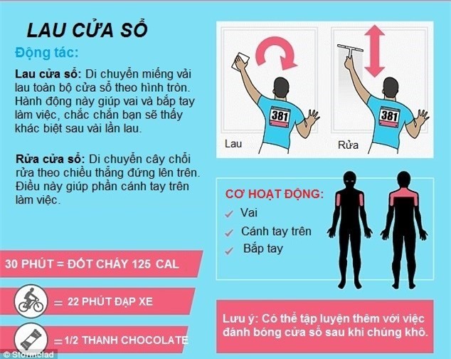 Theo Daily Mail, nghiên cứu mới cho thấy rằng mỗi công việc nhà nhắm đến các nhóm cơ khác nhau, do vậy, thực hiện chúng cùng 1 ngày có thể thay thế các phương pháp tập luyện thông thường như đi bộ, tập gym, đạp xe…