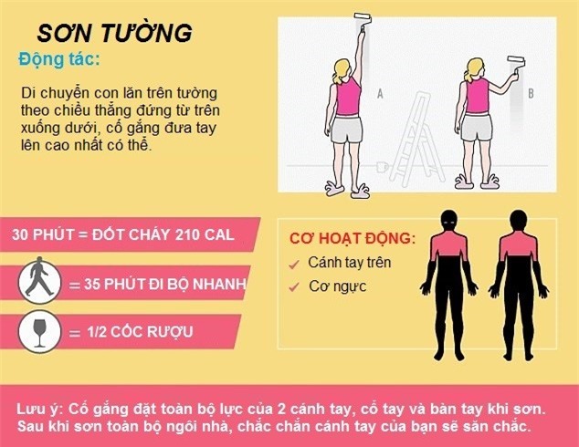 Chuyên gia Andrew khuyên bạn khi sơn tường, nếu muốn thử thách hơn có thể treo thêm 1 vật nào đó lên con lăn hoặc chổi sơn để tăng cường độ khó và đốt cháy calo nhanh hơn.