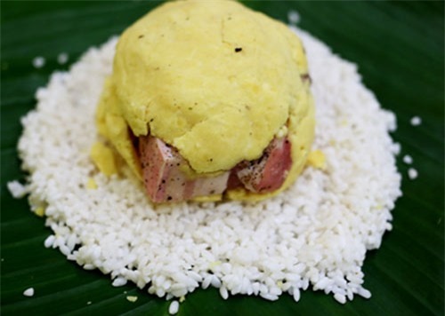 Tiếp đó là một miếng thịt đã ướp để ở giữa, rồi một bát đỗ xanh. Cuối cùng bạn đổ tiếp một bát gạo nếp lên trên cùng rồi gói các lá thừa lại thật gọn gàng, kín đều bánh chưng.