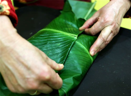 Bước 5: Dùng tay gấp lần lượt lá dong bên phải và trái vào nhưng lưu ý chú ý phải chắc tay. Phần lá dong thừa thì gập mép lại (gập vào bên trong để giấu lá thừa).