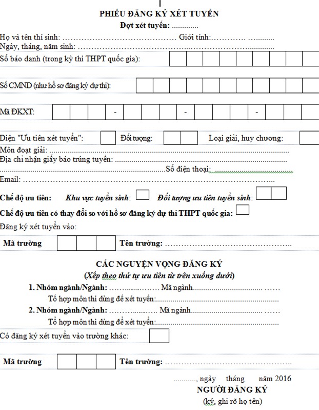 Mẫu phiếu đăng ký xét tuyển như sau: