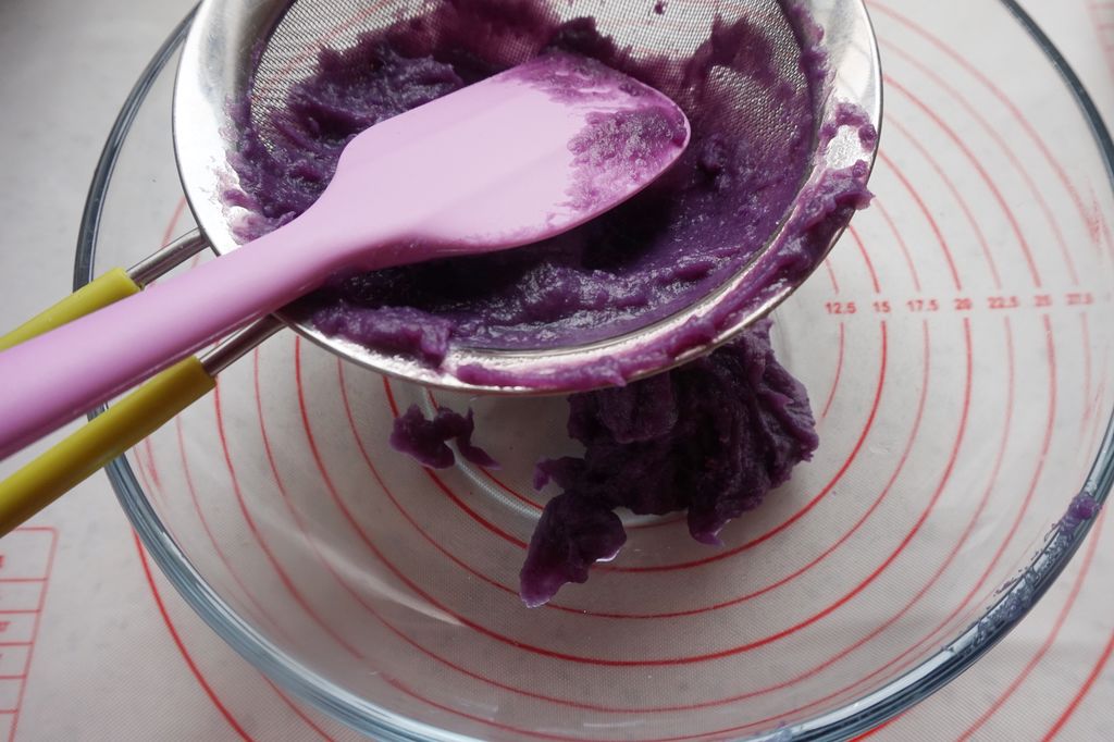 Bước 5: Cho 100g khoai lang tím đã rây vào thố bơ, trộn đều.