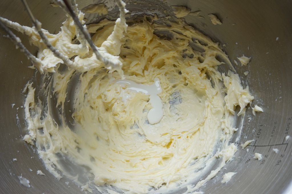 Bước 4: Cho bơ lạt vào thố, thêm đường bột và muối vào đánh cho quyện và bơ chuyển thành màu trắng ngà. Sau đó thêm kem tươi vào đánh bông.