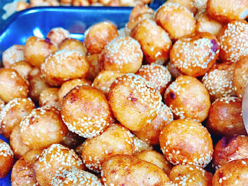 - Vỏ bánh rán vàng ruộm, giòn ngon, thơm phức.