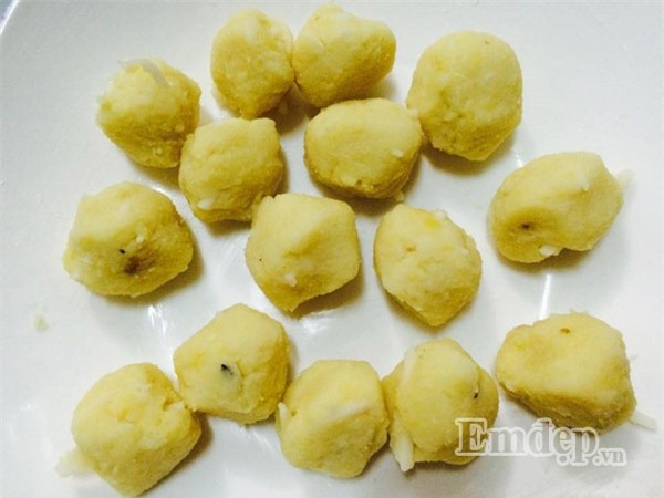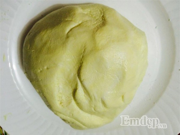 - Để đậu xanh xào dừa nguội, trộn vào 1 thìa nhỏ nước hoa bưởi hoặc bột vani tùy thích tạo mùi cho thơm và viên lại thành từng viên tròn khoảng 10g để lên đĩa riêng làm nhân bánh.