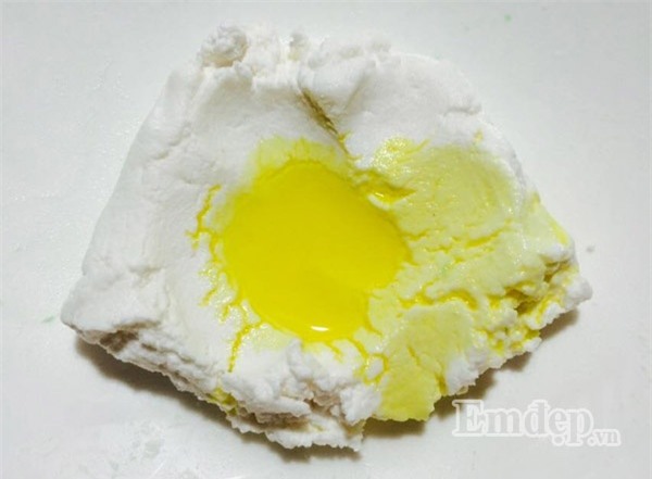 Nhào thật kỹ bột để màu hòa đều nhưng phải thật nhanh tay trong khi bột còn ấm nóng mới dễ nặn bánh, bột nguội sẽ bị cứng lại khó làm, các bạn có thể cho bột vào lò vi sóng quay lại ở mức thấp nhất khoảng 1 phút cho bột ấm lên và mềm ra.